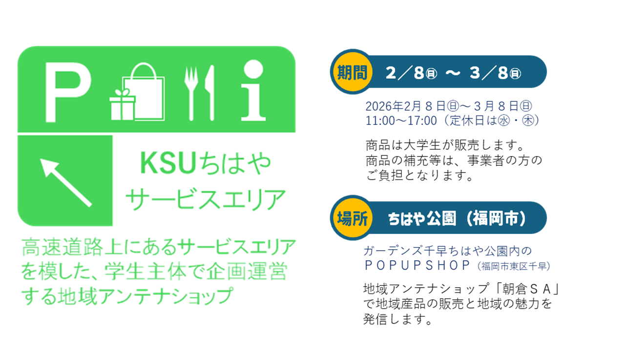九州産業大学、ガーデンズ千早、NEXCO西日本九州支社が地域の魅力を発信する産学官連携プロジェクトを実施。ちはや公園内のPOPUPSHOPにて学生主体で企画運営するアンテナショップ朝倉SA」を朝倉市と連携、期間限定で開設します