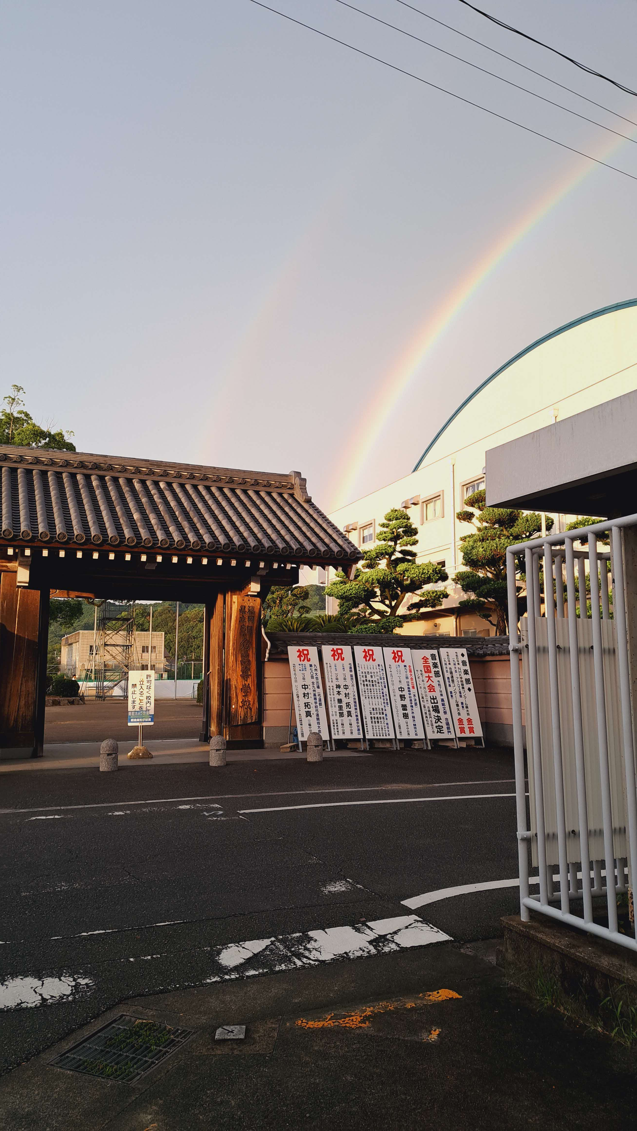 撮影時の思い:この日は部活がなくて、先輩に会いに行ったので少し日が暮れてました。先輩が二重の虹があるって私に教えてくれて思わず写真を撮りました。この写真を見るとこの高校に入らなければ先輩と話すことも、この二重の虹が体育館の丸まった屋根の上にあるのも知らなかったのだろうかと、虹と人の輪に不思議な気持ちを抱きます。