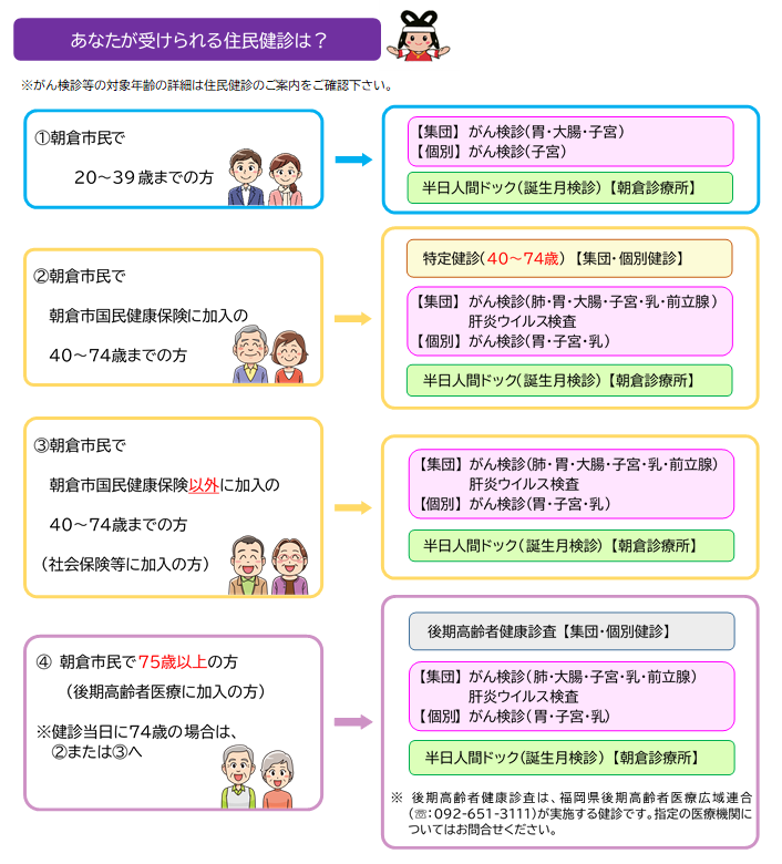 【何を】 がん検診等(加入している保険に関わらず朝倉市民が対象です)
