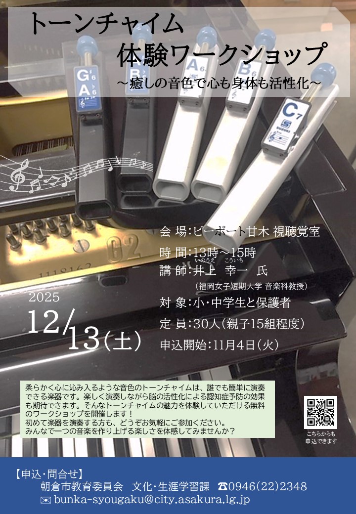 ※メールでお申し込みの場合、件名に【トーンチャイム体験ワークショップ】、本文に【児童氏名/ふりがな】【年齢】【学校名/学年】【保護者氏名】【住所】【連絡先】を記入のうえ送信してください。複数申し込みの場合は、2人目以降【児童氏名/ふりがな】【年齢】【学校名/学年】をご入力ください。