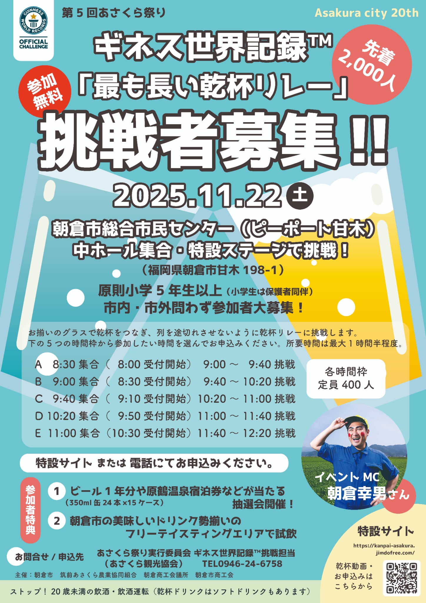 朝倉市制施行20周年を記念し、「あさくら祭り」のなかで、11月22日(土)にギネス世界記録™「最も長い乾杯リレー(Longest Toast Relay)」に挑戦します。