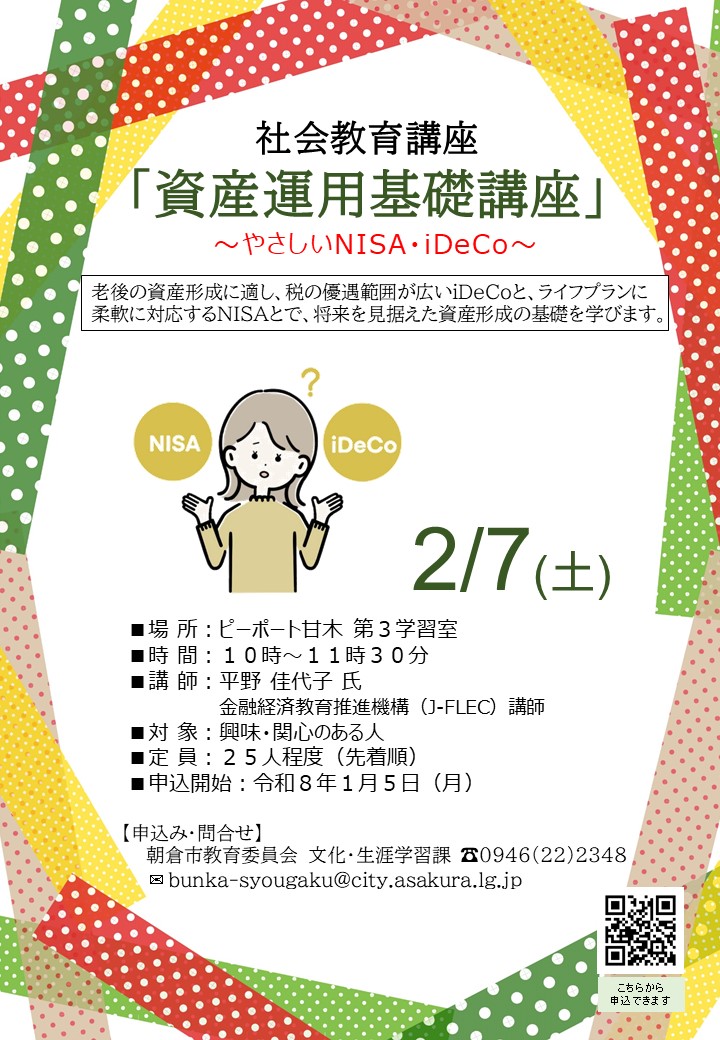 老後の資産形成に適し、税の優遇範囲が広いiDeCoと、ライフプランに柔軟に対応するNISAとで、将来を見据えた資産形成の基礎を学びます。