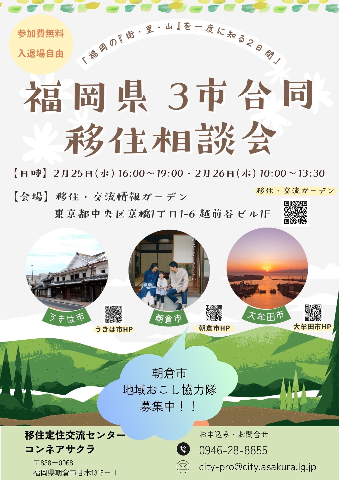 朝倉市、うきは市、大牟田市の合同移住相談会を開催します。