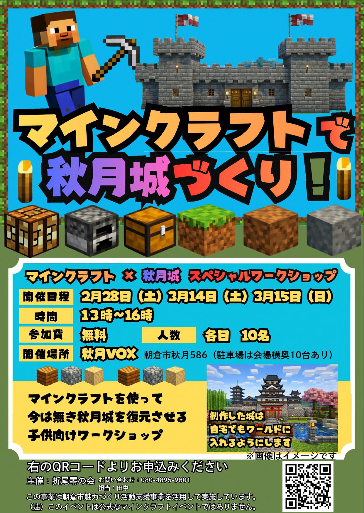 3月14日(土)、15日(日)に秋月VOXで実施予定のマインクラフトで秋月城づくり!!については参加者多数のため、下記のとおり会場が変更になります。